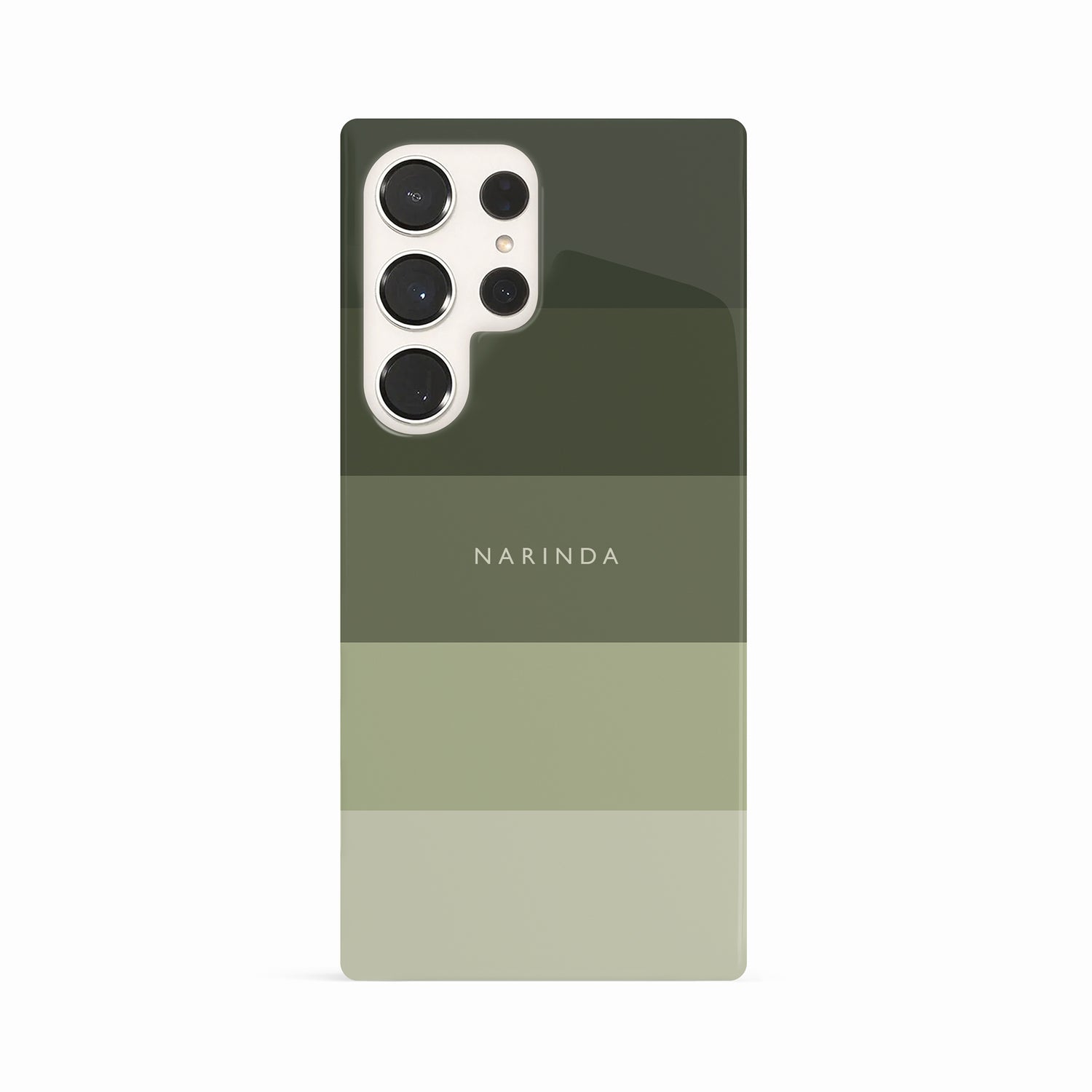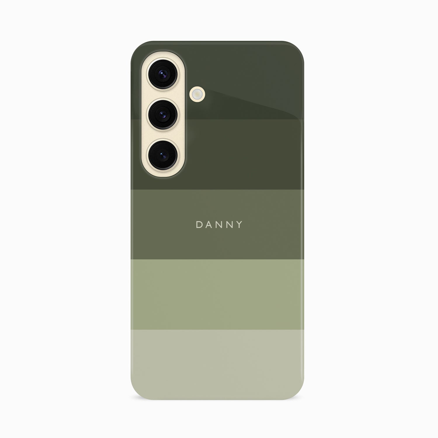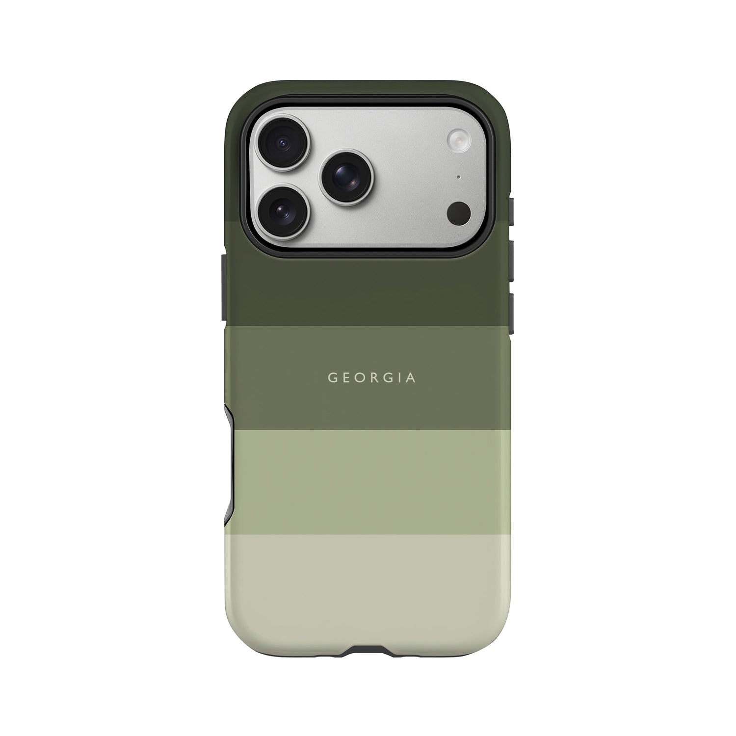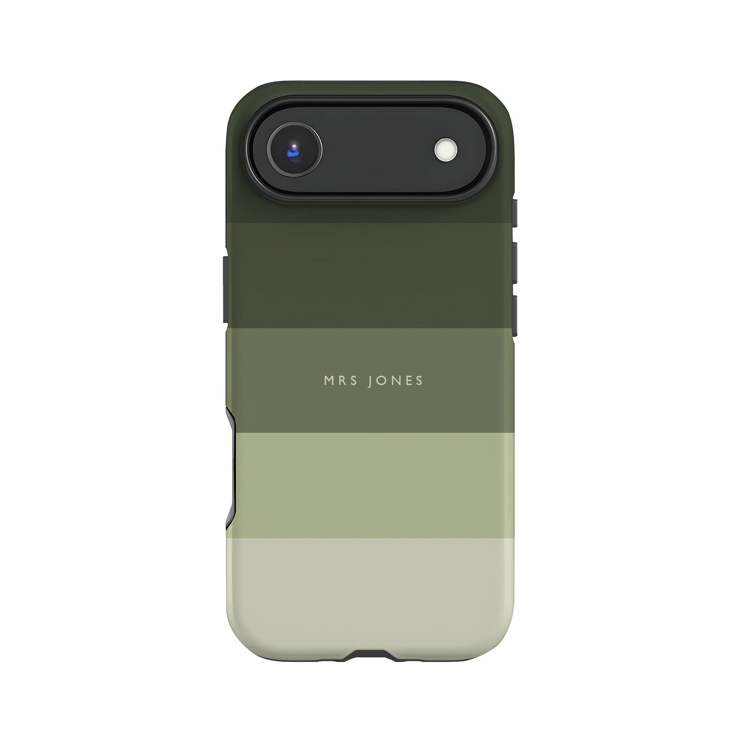 A modern stripe print case in muted green. Personalise with a name of your choice or go with just the stripes. A premium phone case for iPhone 17 and Samsung S25 devices as well as all other iPhone and Samsung Galaxy models listed. Choose from a matte or gloss finish and slim or tough case styles. Independently designed and exclusive to our store.