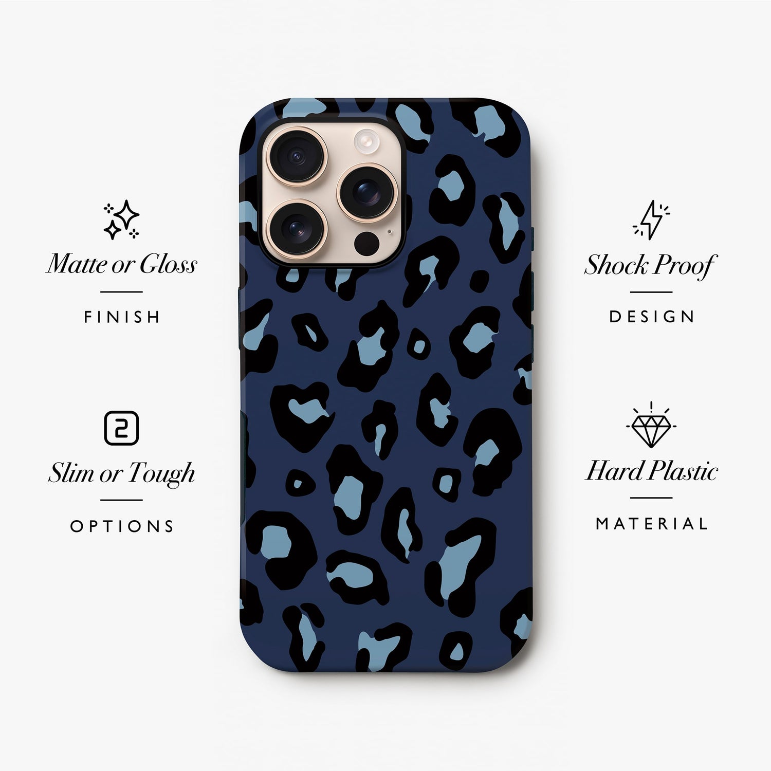 A modern leopard print case in muted navy blue tones. Personalise with a name of your choice or go with just the animal spots. A premium phone case for iPhone 17 and Samsung S25 devices as well as all other iPhone and Samsung Galaxy models listed. Choose from a matte or gloss finish and slim or tough case styles. Independently designed and exclusive to our store.