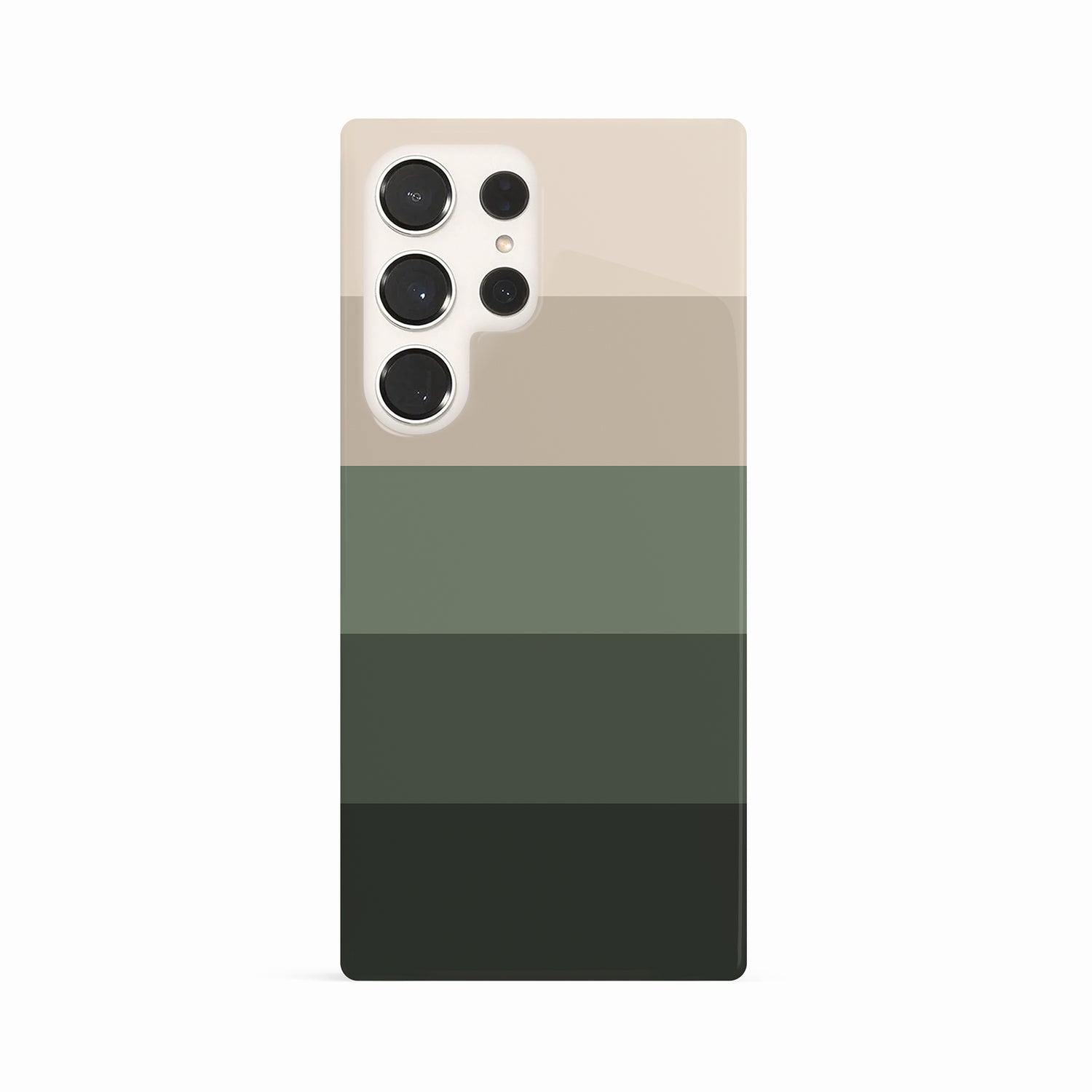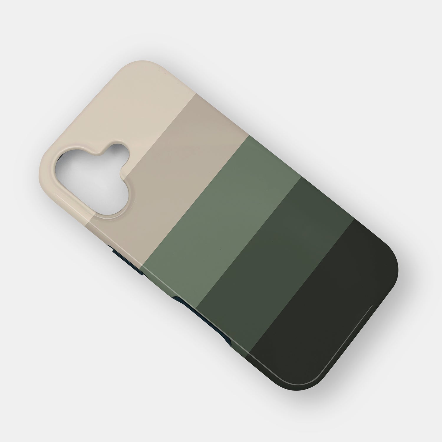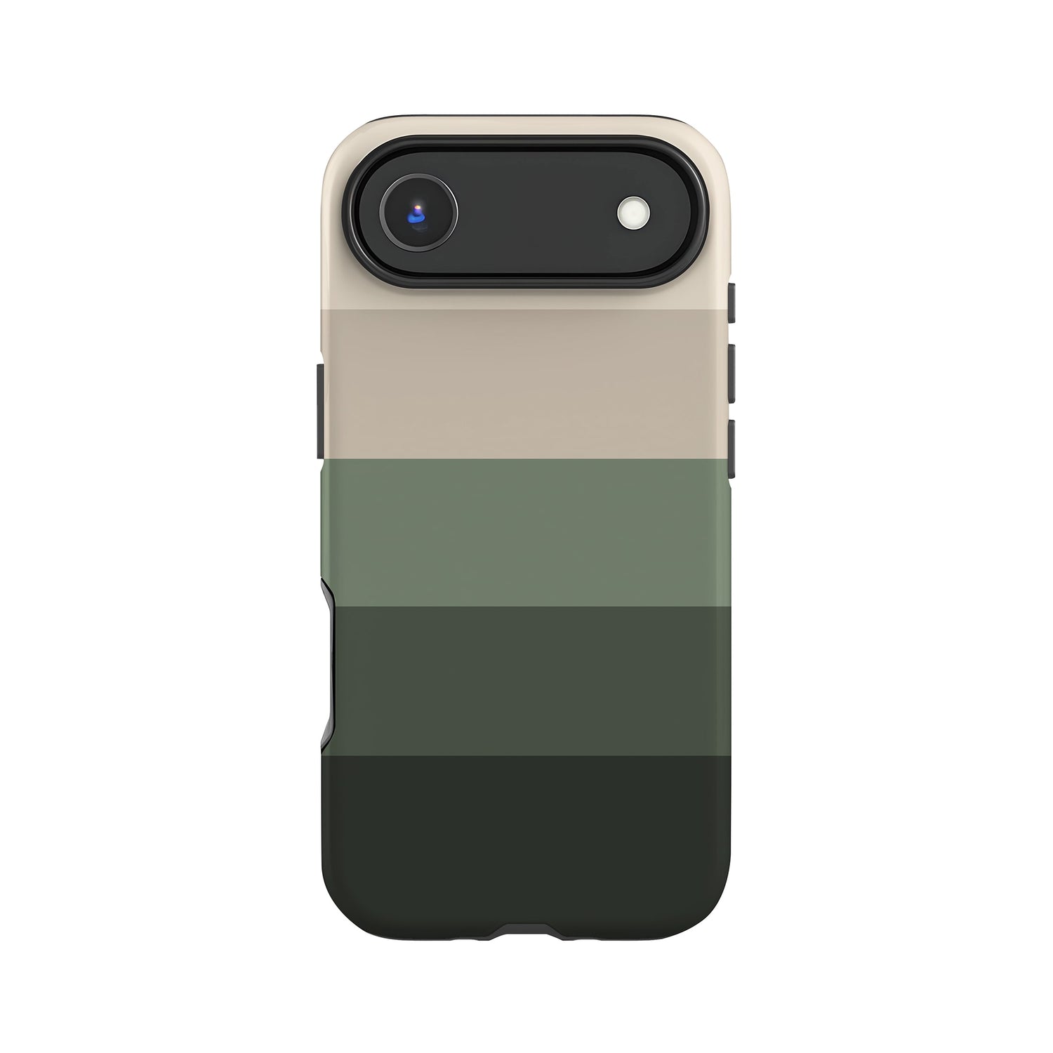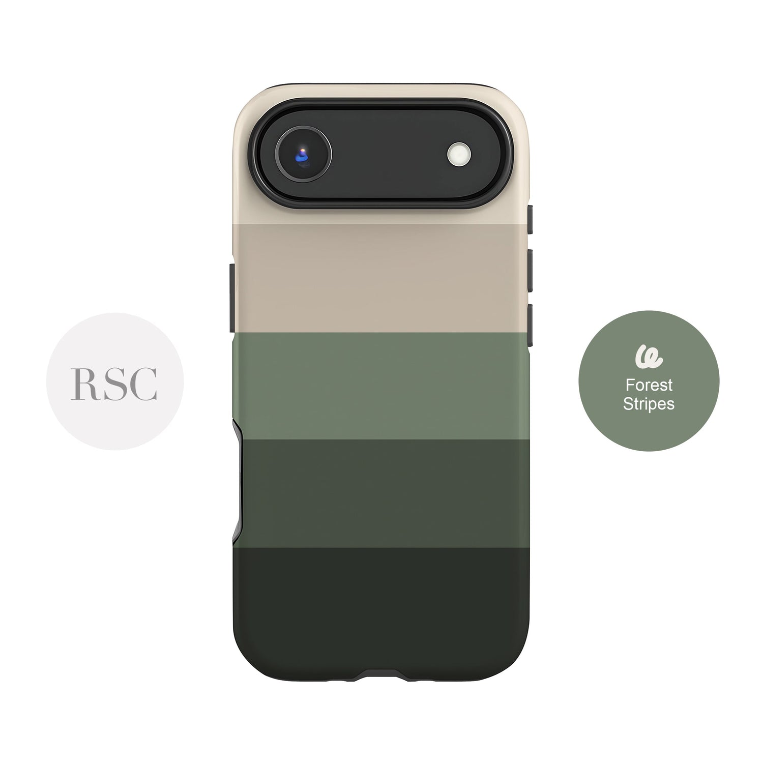 A modern stripe print case in forest green colour tones. A premium phone case for iPhone 17 and Samsung S25 devices as well as all other iPhone and Samsung Galaxy models listed. Choose from a matte or gloss finish and slim or tough case styles. Independently designed and exclusive to our store.