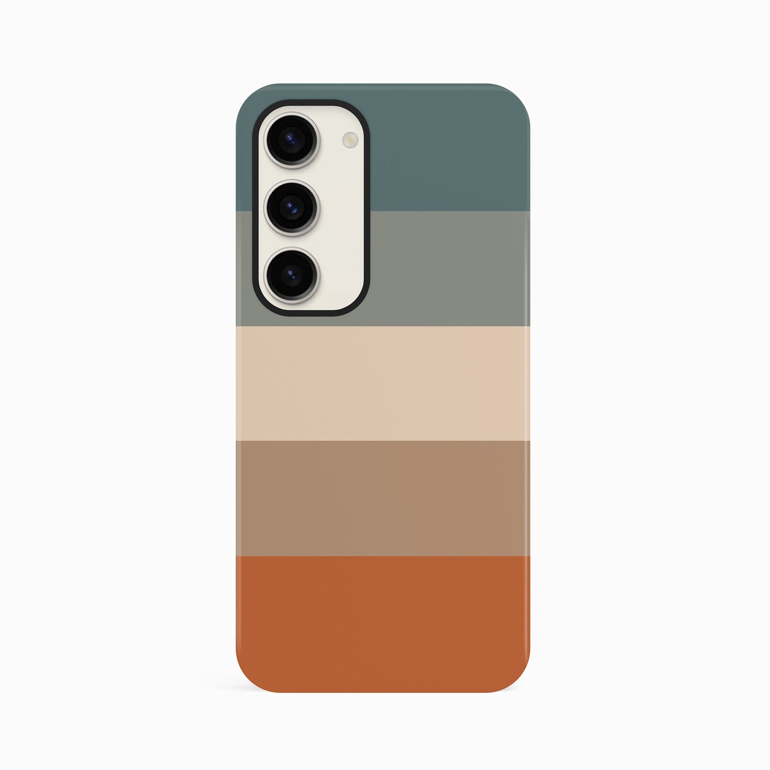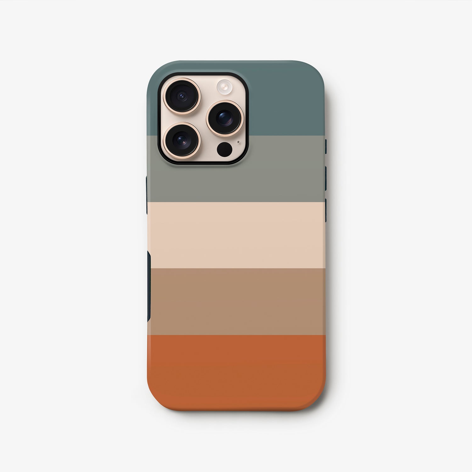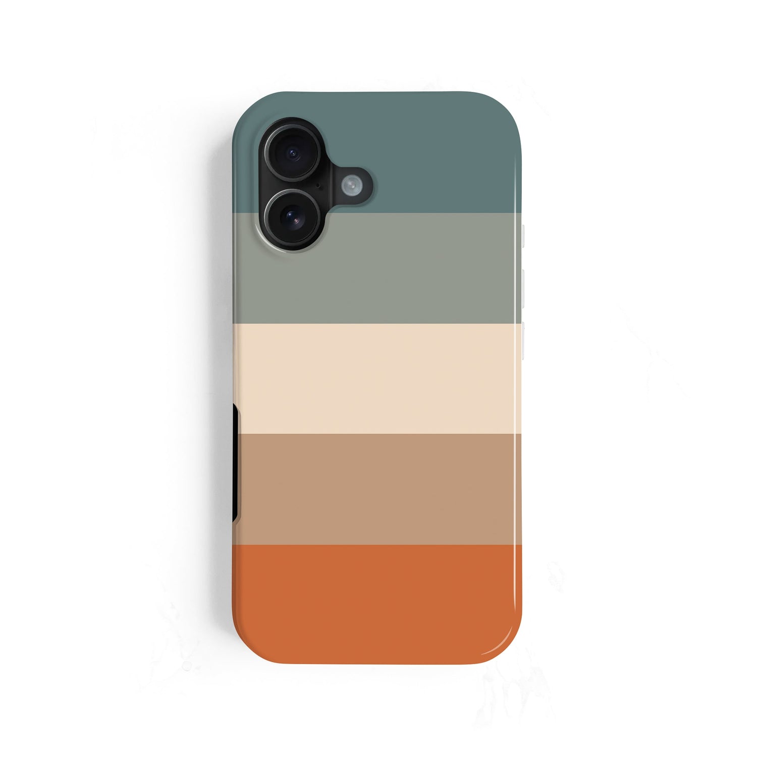 A modern stripe print case in muted blue, orange and creams. A premium phone case for iPhone 17 and Samsung S25 devices as well as all other iPhone and Samsung Galaxy models listed. Choose from a matte or gloss finish and slim or tough case styles. Independently designed and exclusive to our store.