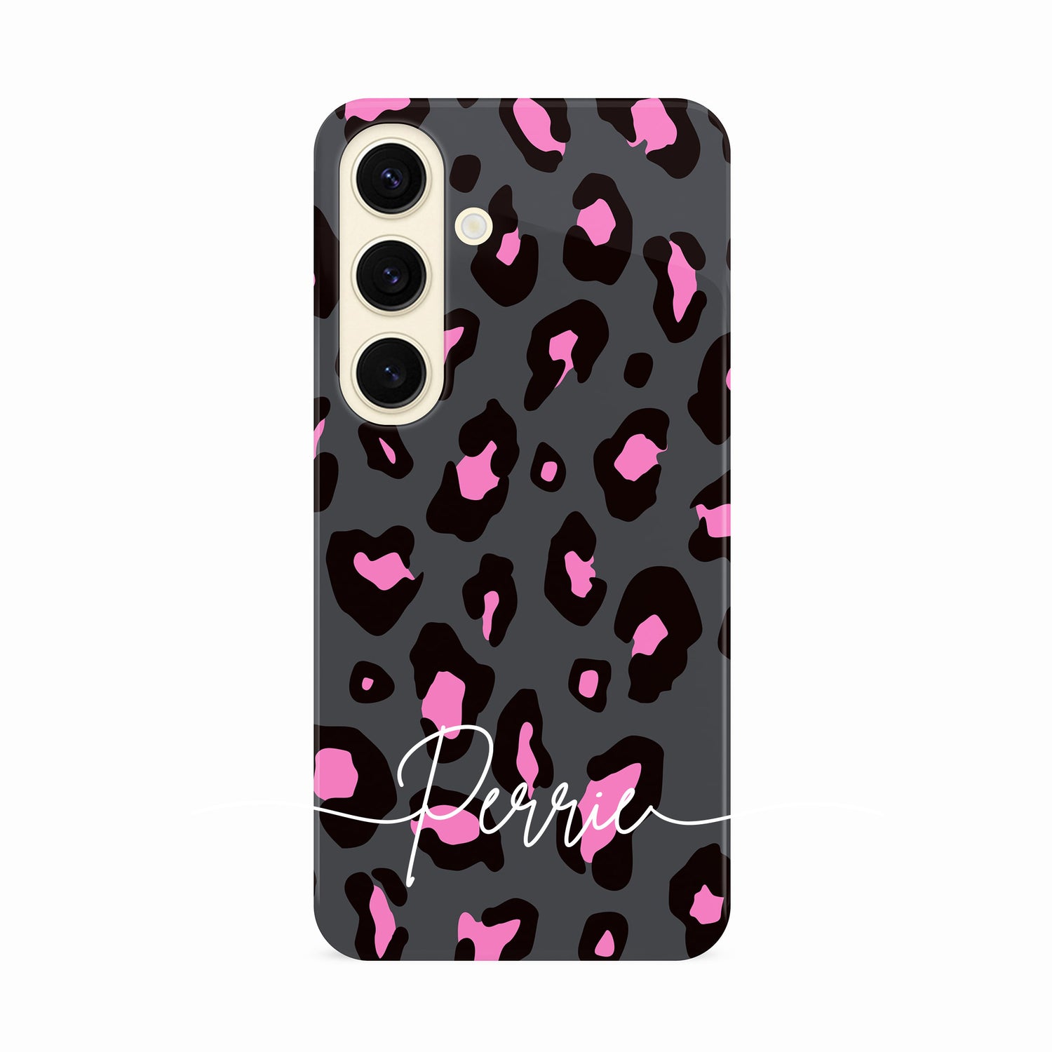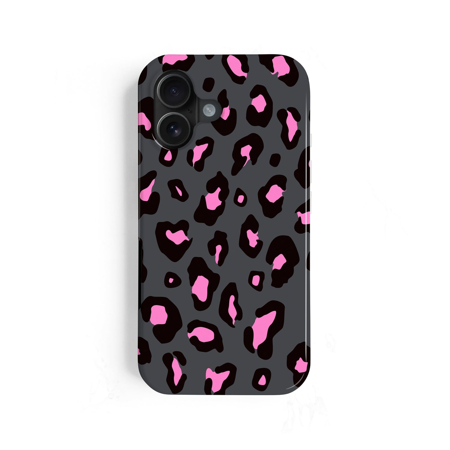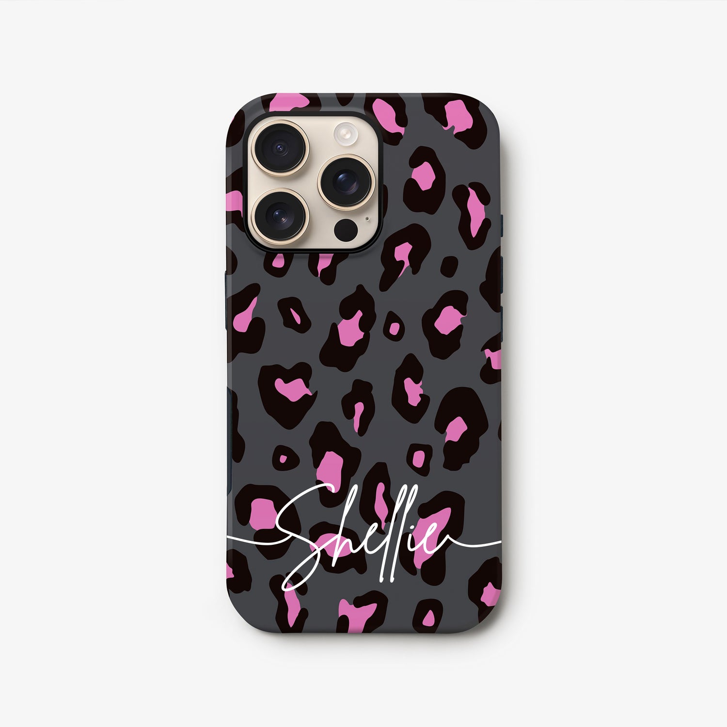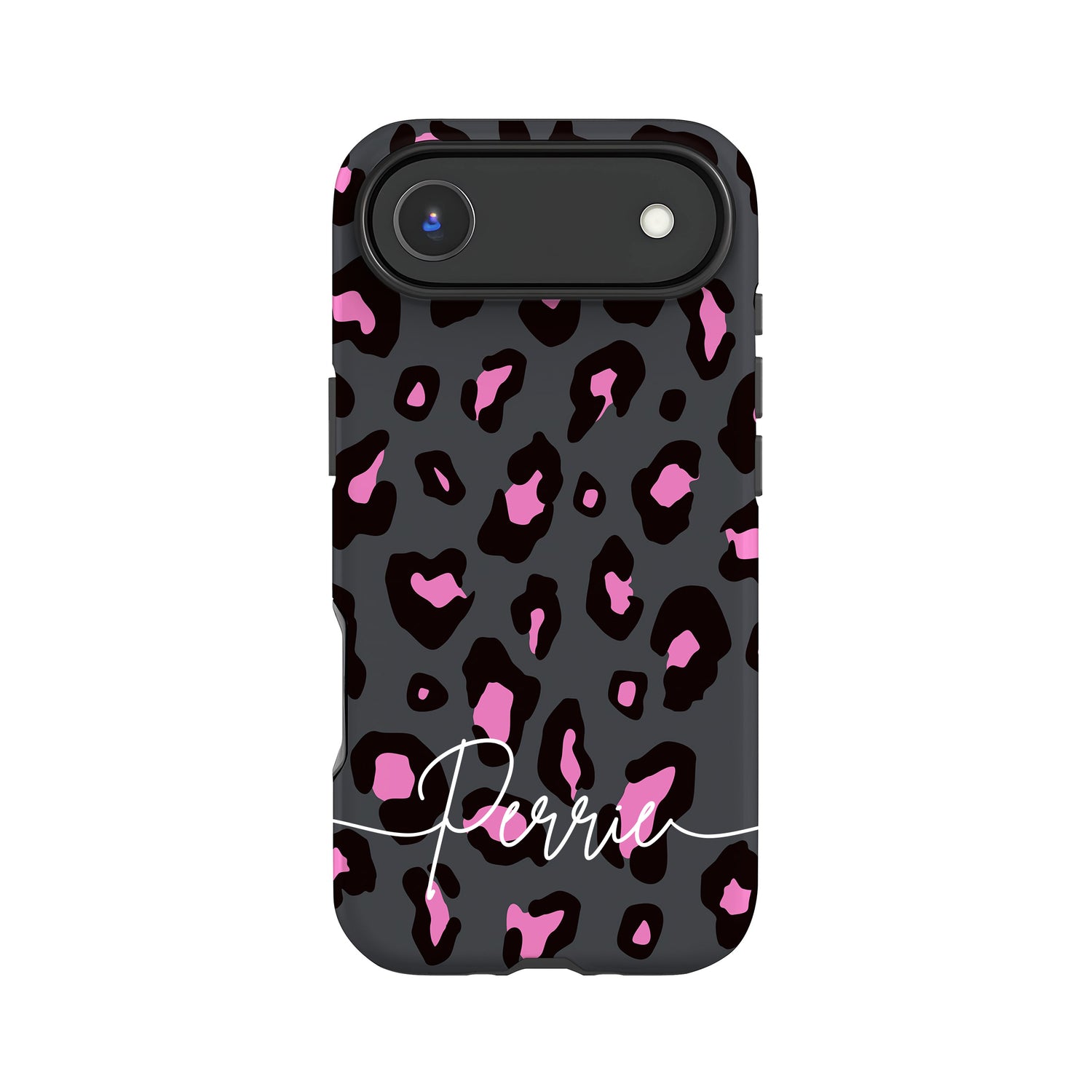 A modern leopard print case in contrasting pink and grey colour tones. Personalise with a name of your choice or go with just the animal spots. A premium phone case for iPhone 17 and Samsung S25 devices as well as all other iPhone and Samsung Galaxy models listed. Choose from a matte or gloss finish and slim or tough case styles. Independently designed and exclusive to our store.