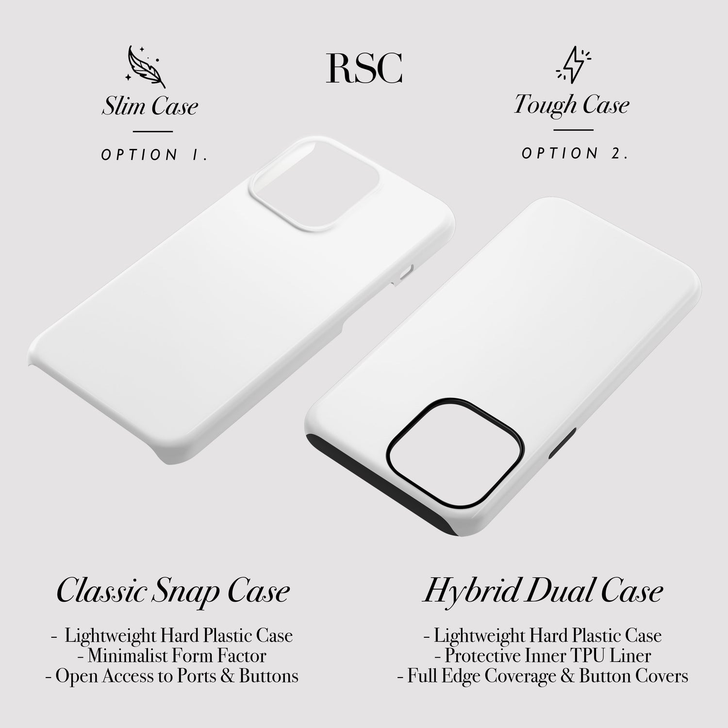 Our iPhone cases and Samsung Galaxy covers come in two styles - 'Slim' or 'Tough'. Our 'Slim' phone cases are classic hard plastic snap-on covers with openings for all ports and buttons. Our 'Tough' phone cases are designed to provide the perfect blend of style and protection - a hard plastic outer polycarbonate case with an inner soft TPU liner case that covers all edges and buttons. Raised camera lens protection and a slightly raised screen lip also adds extra security and peace of mind.